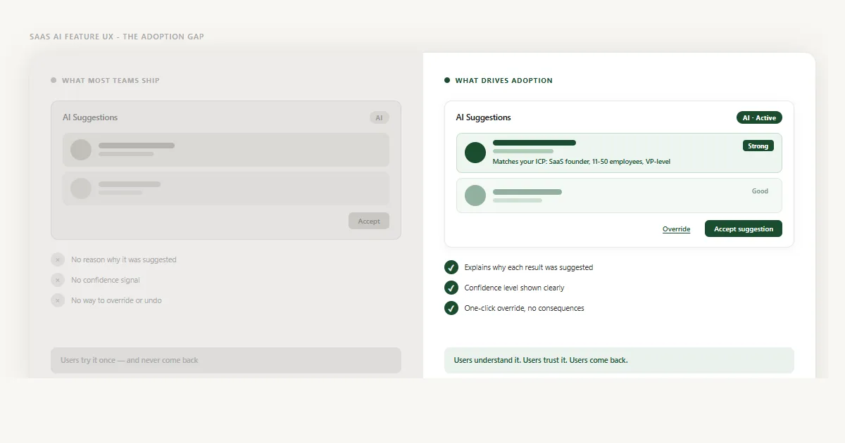 This is the adoption gap: a distance between what the AI can do and what users feel safe acting on. It's a design problem, and it has three root causes that appear in almost every low-adoption AI feature I've reviewed.